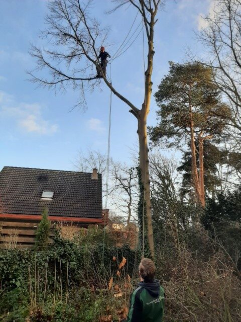Deze boom moest gekapt worden maar kon niet vallen. Dat wordt dus klimmen en stukje bij beetje de boom naar beneden. Voor onze klimmer geen probleem.