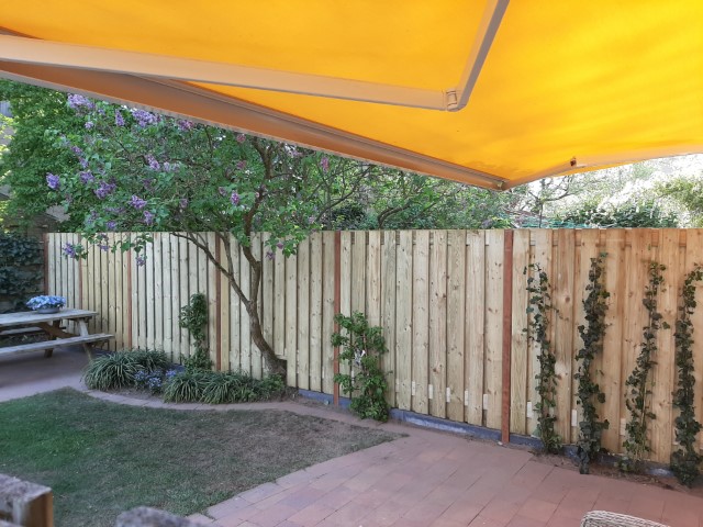 Douglas schermen met verticale planken, zo kunnen kinderen er niet tegenop klimmen. We hebben hardhoutpalen gebruikt zodat deze klant nog vele jaren plezier kan hebben van deze fraaie schutting.
