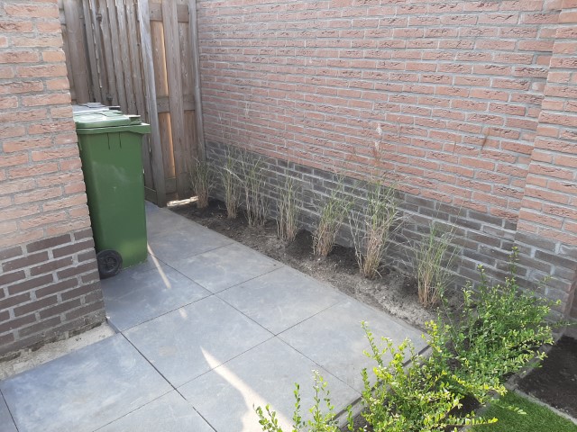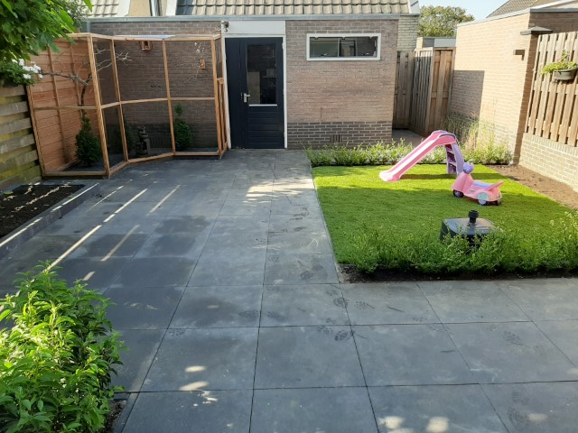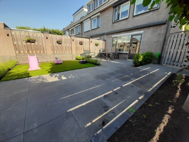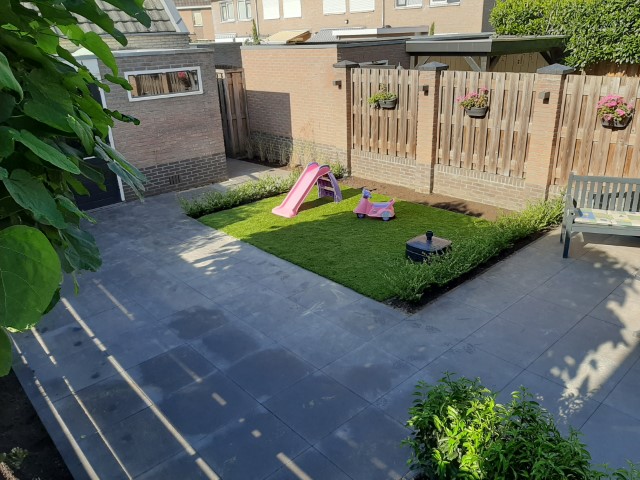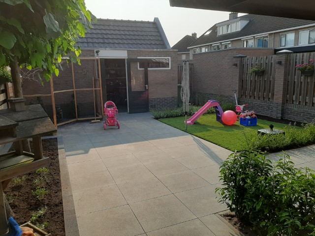 Een praktische en kindvriendelijke achtertuin. Veel straat zodat de kleine kinderen heerlijk kunnen fietsen en poppenmoedertjes fijn kunnen wandelen. Een stukje gazon zodat er toch wat groen in de tuin is en heerlijk zacht voor de kindervoetjes. En ideaal voor een zwembadje in de zomer.