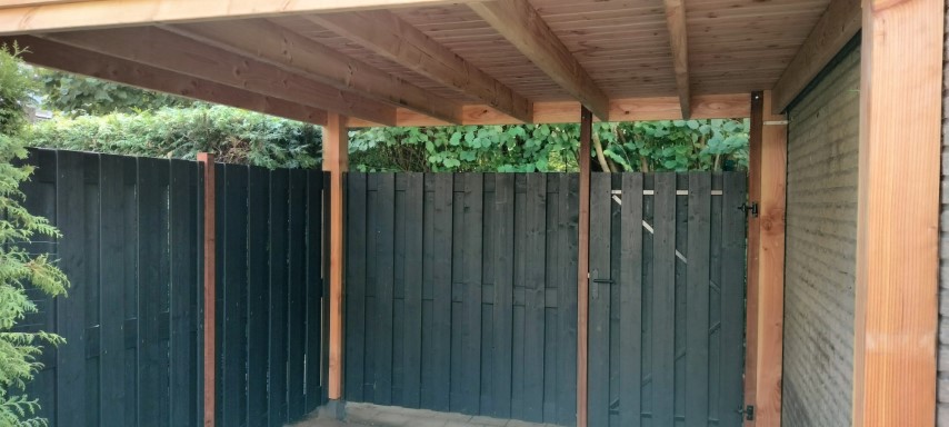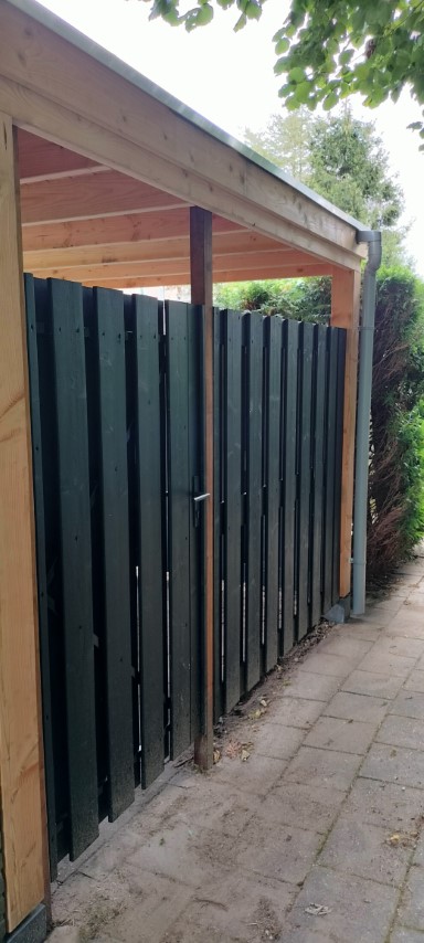 Praktische op maat gemaakte overkapping, welke exact overloopt van de stenen berging in de houten overkapping. Vakwerk!