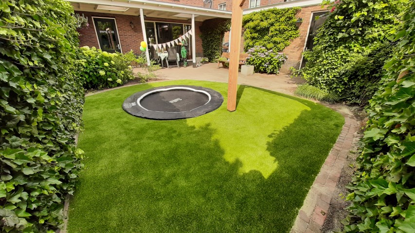 In deze bestande tuin mochten wij een in ground trampoline plaatsen en een schommel. Deze klant koos voor kunstgras, praktisch en met valdemping er onder ook veiliger voor de kinderen.