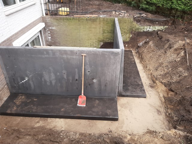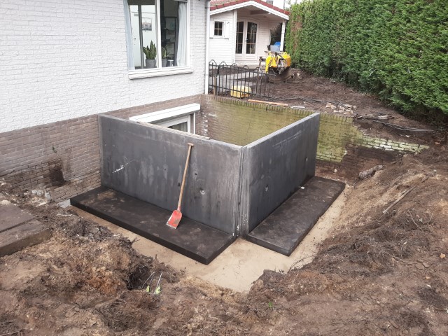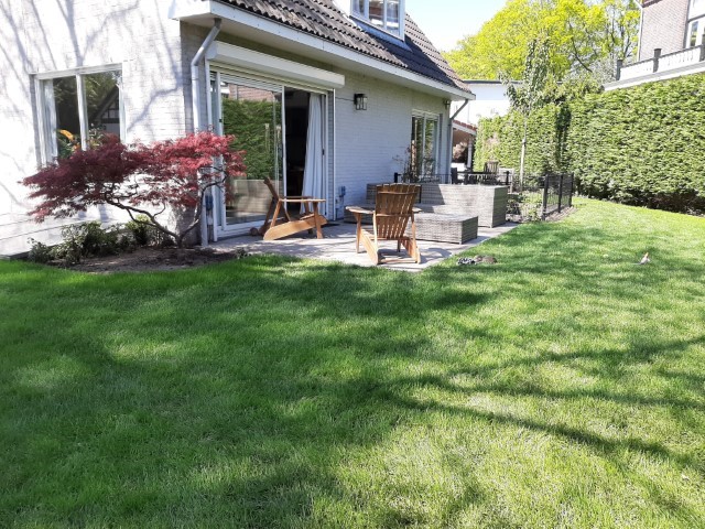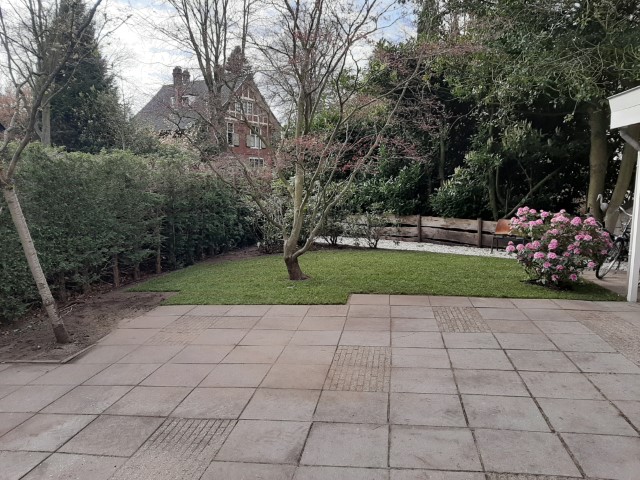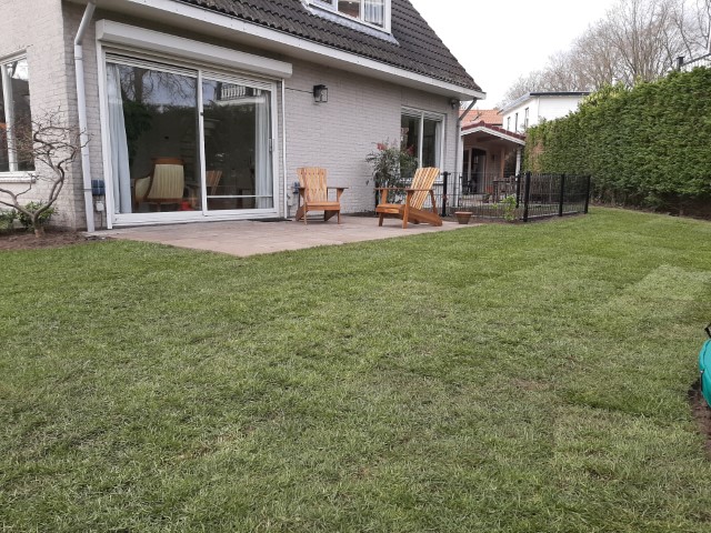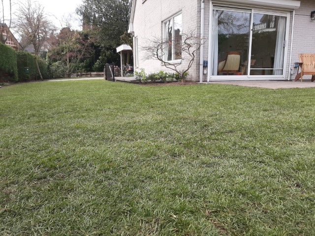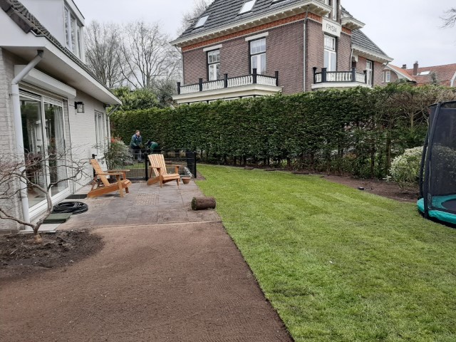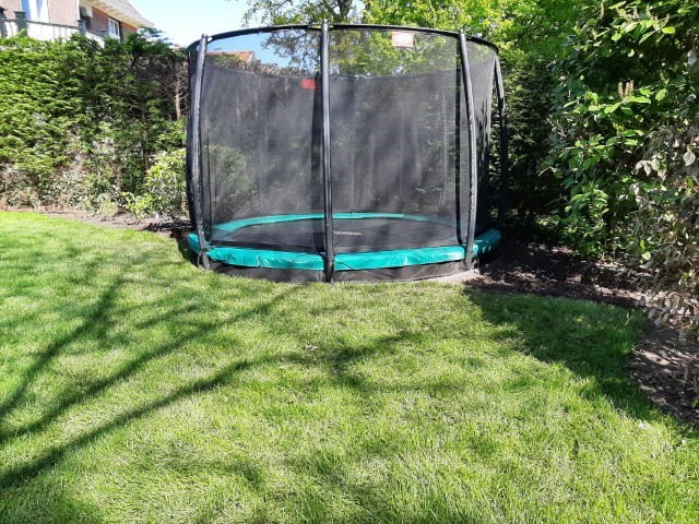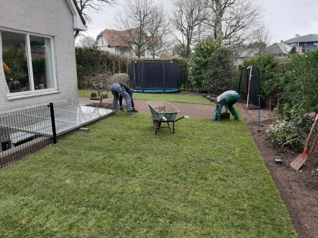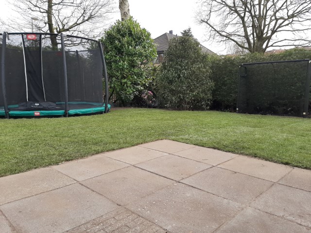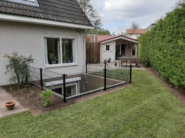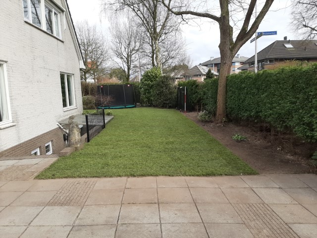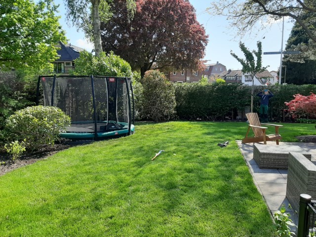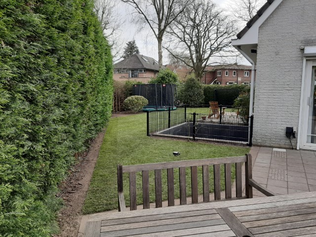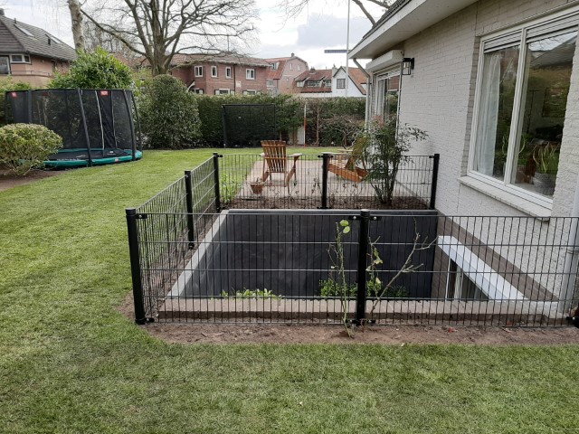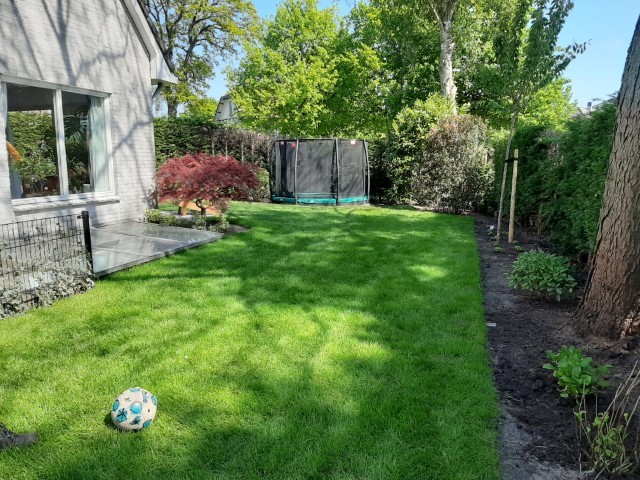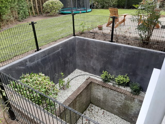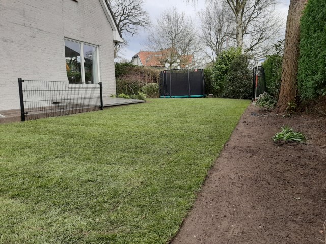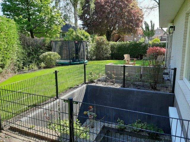 Veelzijdig project. Nieuw gazon, plaatsen van dubbelstaafmat hekwerk, gedeeltelijk opnieuw inplanten, realiseren van grote koekoek/lichtschacht voor meer licht in de kantoorruimte en plaatsen van een trampoline.