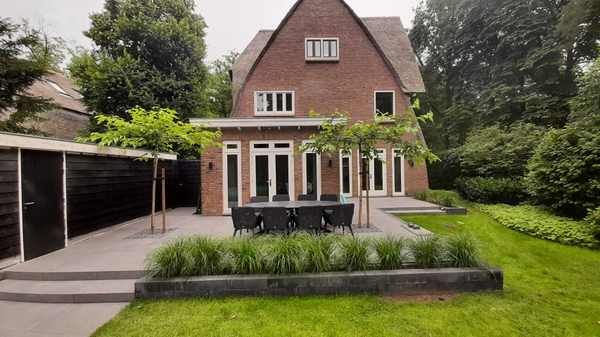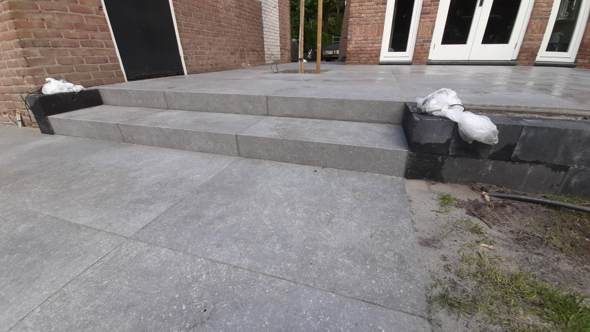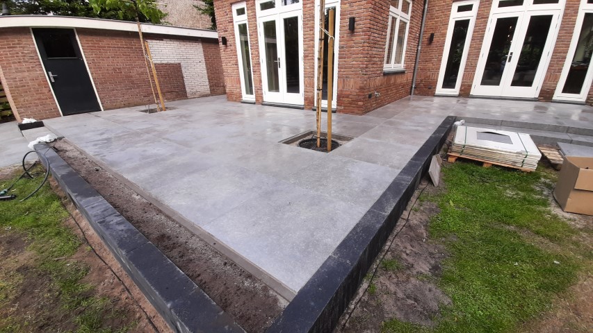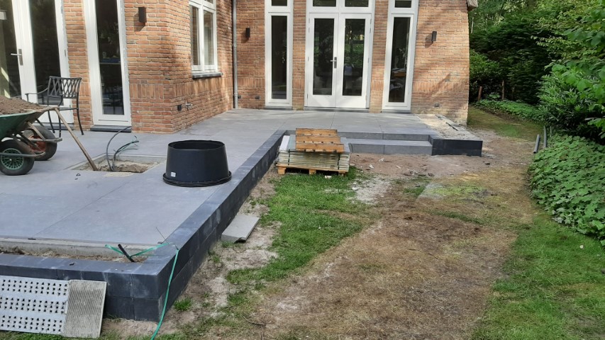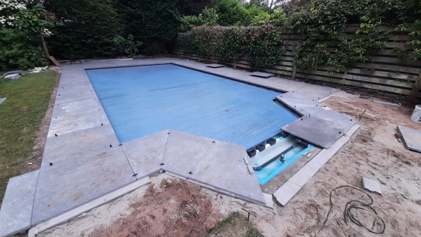 De terrassen en de zwembadrand mochten wij vervangen. Grote 80x80cm. keramische tegels. Traptreden en een verhoogde border/bloembak om het hoogte verschil op te vangen. Dakbomen om het geheel een sfeervolle uitstraling te geven.