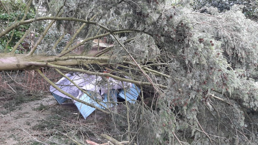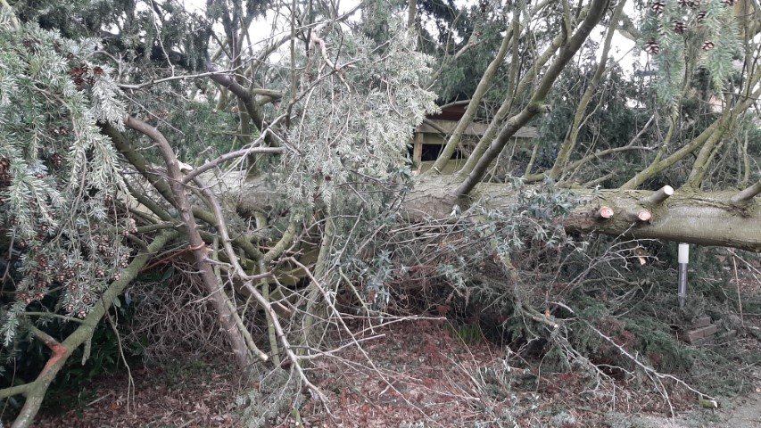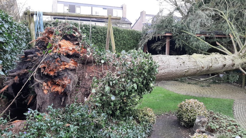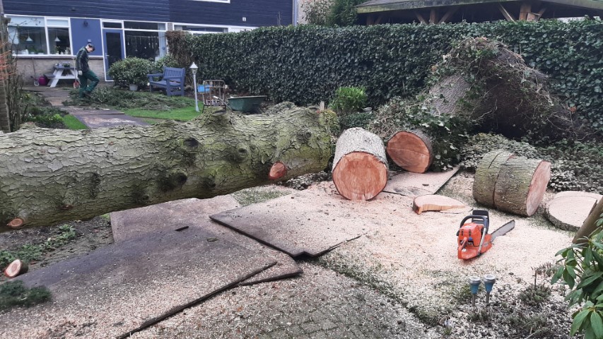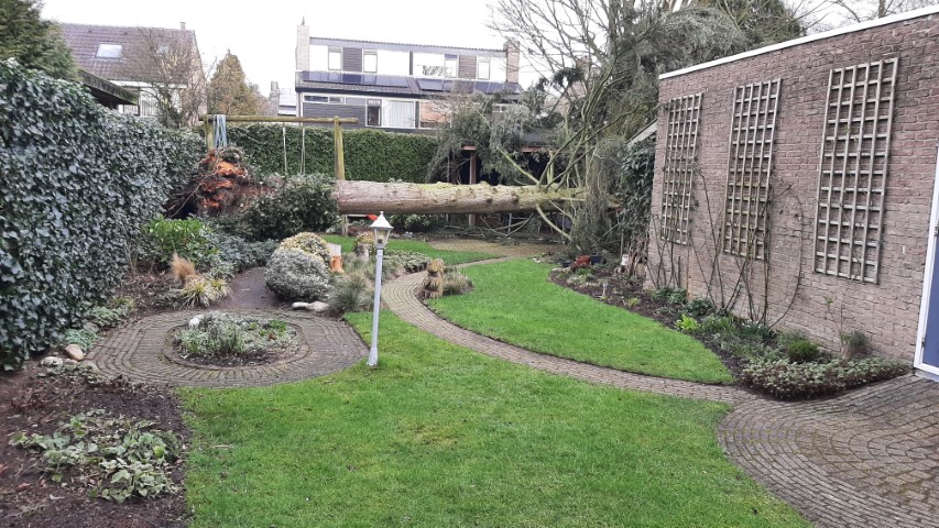Door storm was deze boom geveld in een achtertuin met alle gevolgen van dien. Toen de storm weer wat gestild was konden wij snel in actie komen om de boom te verwijderen. Een hele operatie om de boom uit een relatief kleine achtertuin te krijgen waar hij veel schade aangericht heeft. Maar het is weer gelukt.